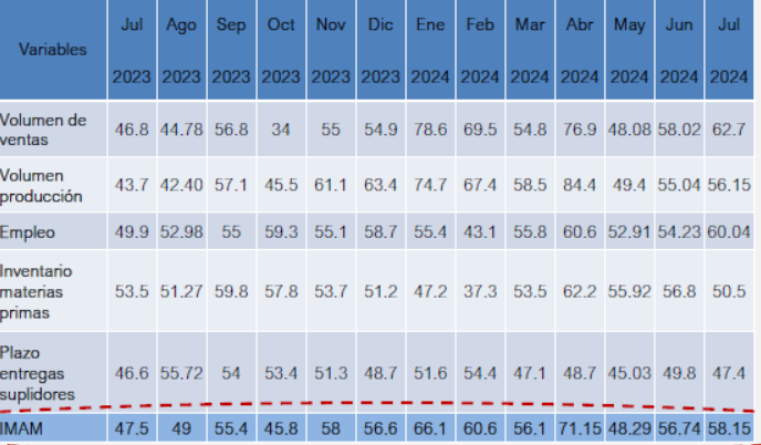 En cambio, la variable “inventario de materias primas” descendió de 56.8 a 50.5 y “plazo de entrega de suplidores” también descendió al pasar de 49.8 en junio a 47.4 en julio 2024.