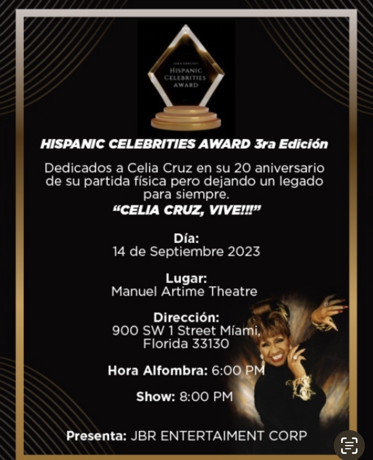 Miami, Florida. JBR Entertaiment presenta la tercera edición de los Hispanic Celebrities Award, dedicada a la Reina de la Salsa, Celia Cruz en conmemoración de los 20 años de su partida física y la celebración de su gran legado para todas las generaciones.