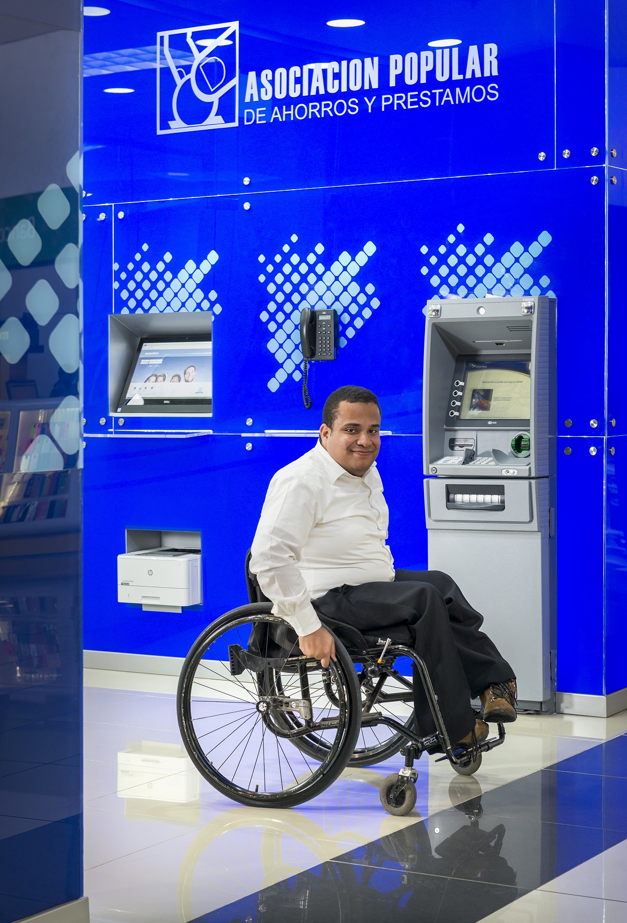 En la actualidad el 100% de los cajeros automáticos de APAP han sido adaptados para que las personas con discapacidad visual puedan realizar sus transacciones de forma segura y autónoma, y que más del 90% de los canales digitales son accesibles.